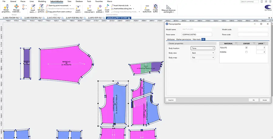 Thanks to the 2D/3D integration, any alteration made into a 2D pattern will be instantly replicated into its 3D representation. You can set the 3D proprieties directly from the 2D (exportability, materials definition, quantity definition, cluster positioning, texture maintenance). This will allow you to instantly see how each of your actions will affect the final result.