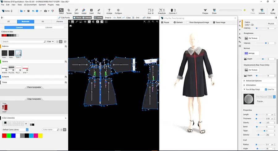 Thanks to the comprehensive integration with VStitcher, you can directly import any Create pattern through the plug-in and design a photo-realistic rendering of your clothing. This allows you to find any imperfections and correct them before production.
