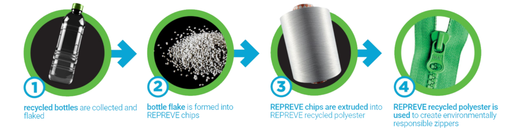 Whether it’s for jackets, bottoms, or handbags, by utilizing more sustainable zippers throughout the design processes, apparel companies can effectively conserve more water, cut back on carbon emissions and greenhouse gases, and ultimately prevent millions of plastic bottles from ending up in landfills and oceans.