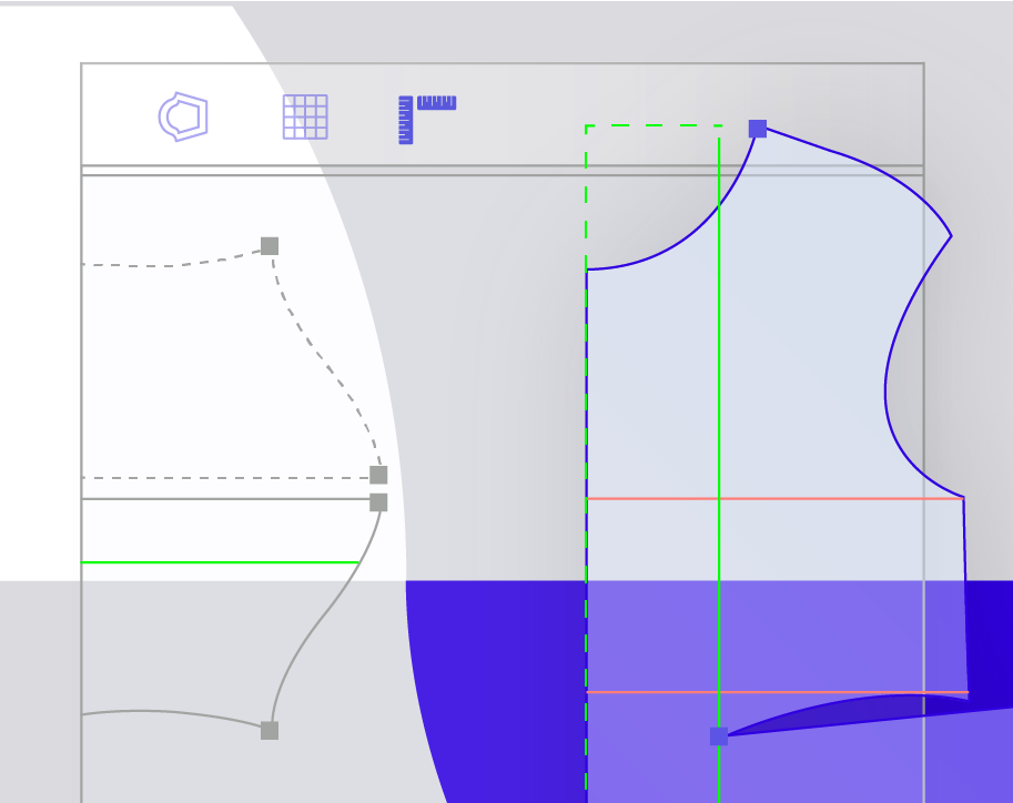 First, we clone the garment and slice the waistline to create a skirt. Then, we take it up a notch by converting the diamond dart into unique holes and canceling the inner symmetry to work on half of the pattern.